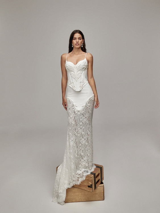 Embellished with pearls and lace detailing, the corset exudes refined femininity and adds a touch of luxury to the design. The lace skirt flows gracefully from the hips, creating a soft and romantic contrast to the sculptural top.