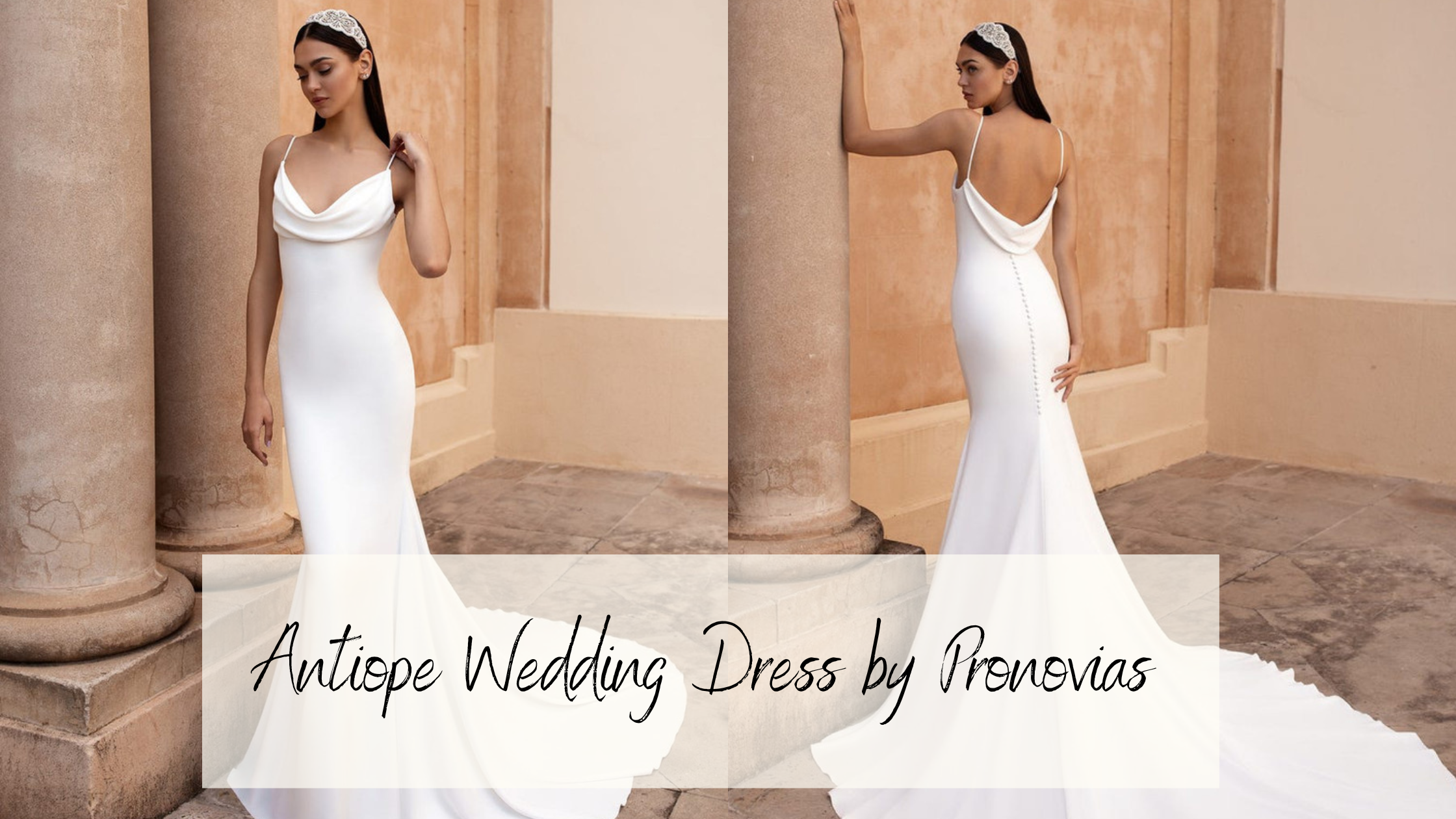 Antiope by Pronovias is a stunning and flattering dress with loose draping along the neckline and back. This dress is a perfect choice for a modern bride looking for a simple dress which does not lack a flirty and feminine touch.The dainty spaghetti straps on this dress beautifully frame the face of the bride and soften the top of the dress. The a-line sillouhette of this dress will flatter many figures while giving an hourglass illusion. The fitted waistline showcases the brides natural curves and gives the dress a structured yet dainty look. If you are a bride looking for a more figure hugging look, this stunning dress also comes in a mermaid sillouhette. This dress has been made using crepe material, making it lightweight and perfect for a summer wedding. The draping on this dress is mirrored on the front and backline. It adds a modern twist to this otherwise classic gown. The low back of this dress adds a flirty and feminine feature to this dress, while not sacrificing support or comfort. The chapel length train of this skirt creates the illusion of a higher volume skirt. Any summer bride would be lucky to wear this gorgeous wedding gown by Pronovias.