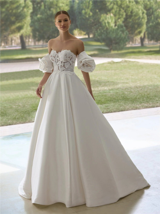 With a mikado skirt that adds structure and a lace bodice that brings lightness, this princess-cut dress plays with contrasts. The sweetheart neckline and detachable sleeves with draped flowers complete a dramatic design, perfect for a bride seeking an impactful and transformable look.